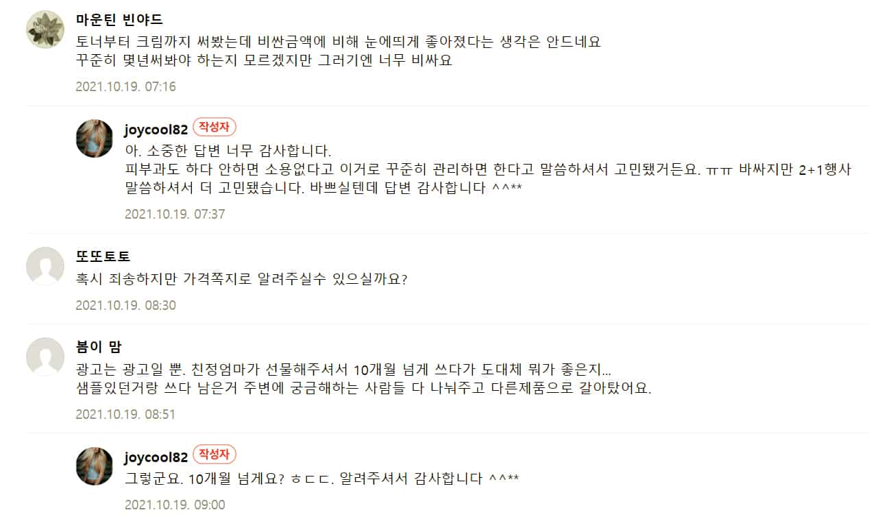 보통 한번 쓰면 2개월은 쓰는 걸로 봐서는 한달 기준으로 20만원 정도로 보시면 되겠는데요. 특히나 크림과 마스크팩은 정말 효능이 좋다고 후기가 좋으네요. 부모님 선물용으로도 많이들 사는 것을 보면 젊은 사람들도 꽤나 아는 브랜드인것 같습니다.